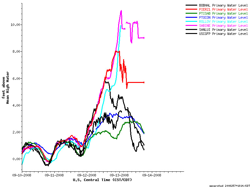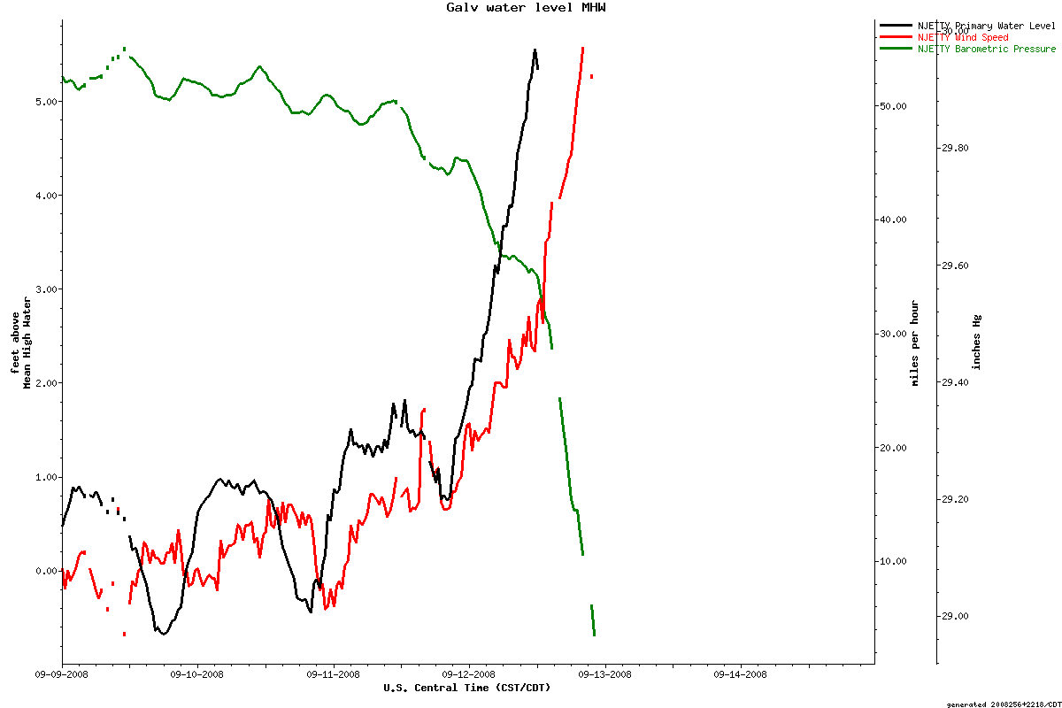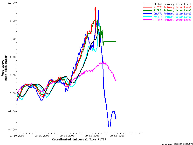 Ike surge at Morgan Point in Galveston Bay, Clear Lake, Pier 21